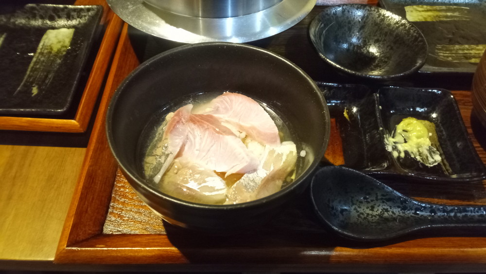 さて、刺身を半分残して、ご飯が1/3くらいになったところで、出汁をもらう。