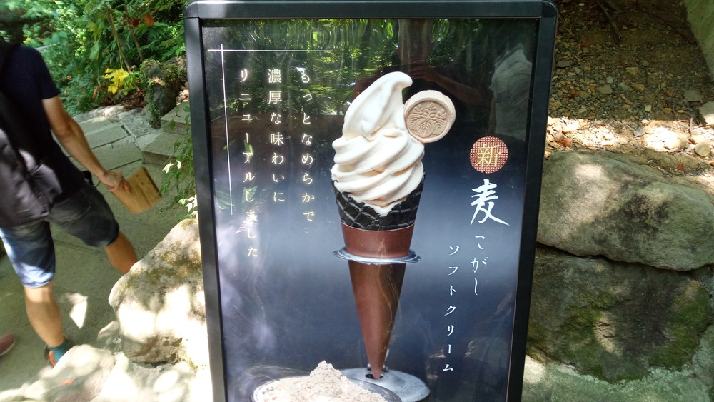 麦こがしソフトクリームが、リニューアルしたという看板が出ていた。