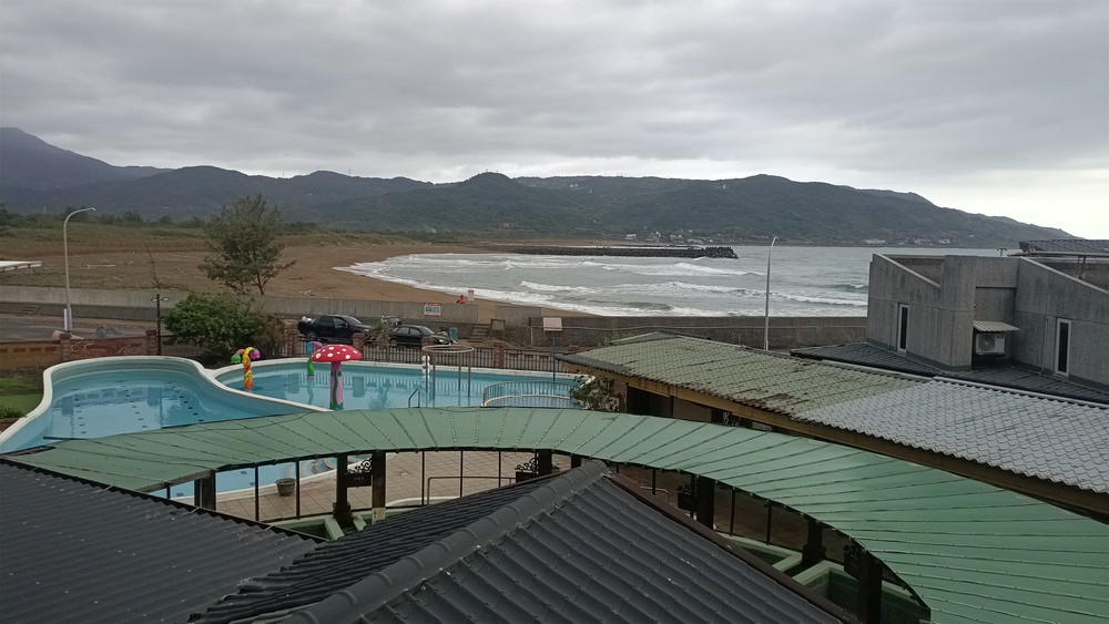 窓から外を見ると、新金山海水浴場が見える。